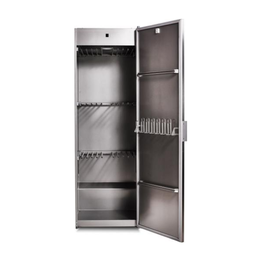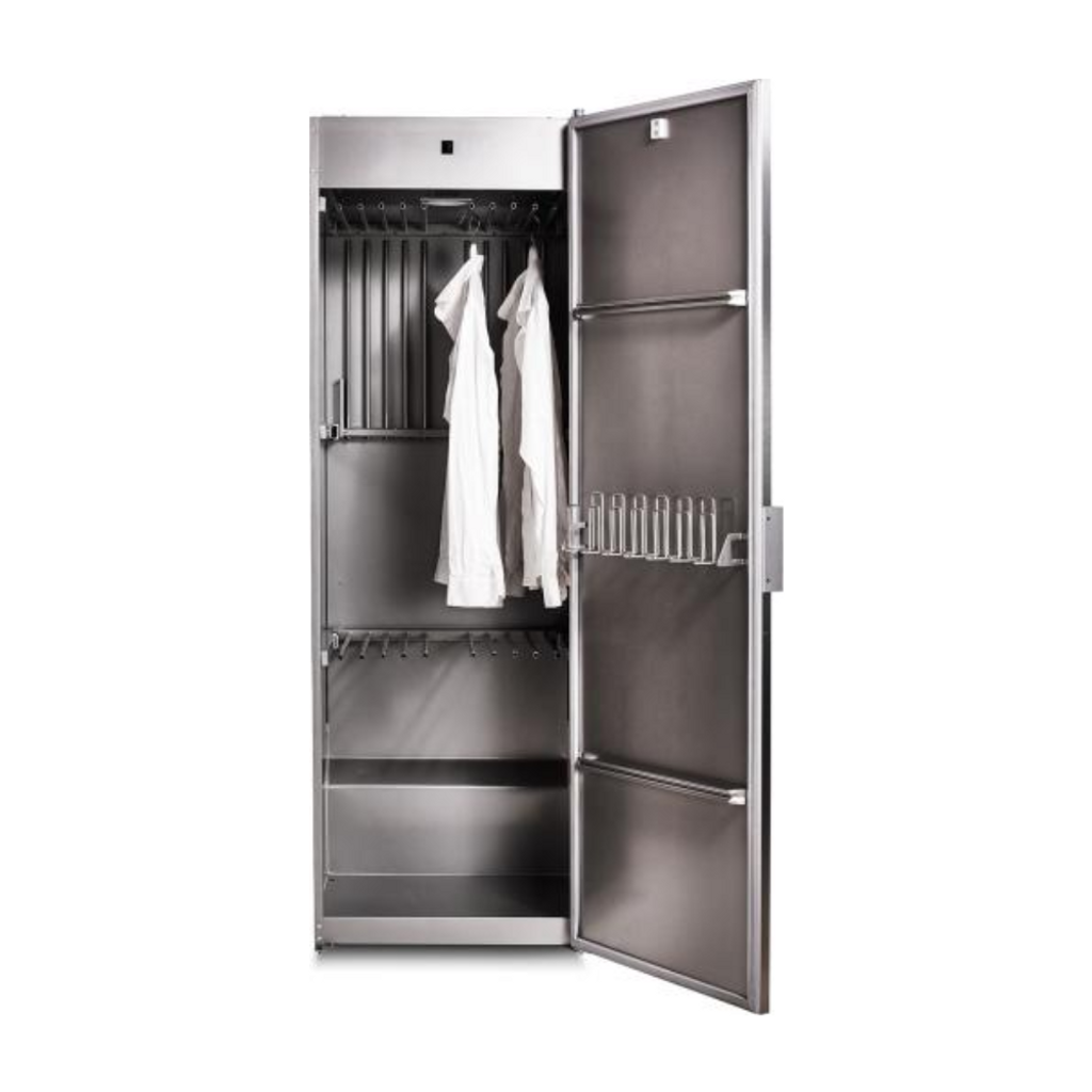 Professionellt torkskåp i rostfritt stål med frånluft, 16 meter torkyta och 8 program. Skonsam och flexibel torkning för kläder, skor och känsliga textilier.