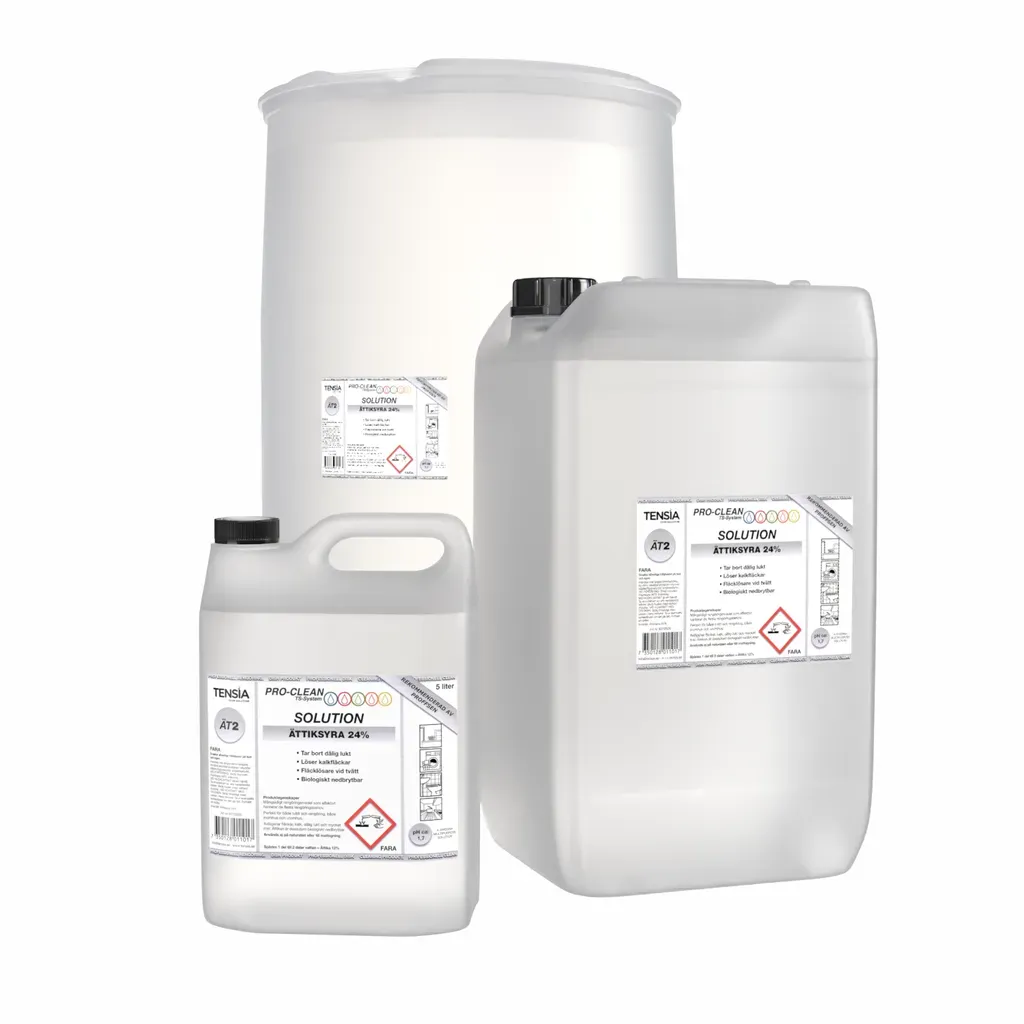 Pro-Cleans Ättiksyra 24 % är en kraftfull och mångsidig vätska med naturligt färglös karaktär och ett pH-värde på cirka 2,2. Produkten kan användas inom flera olika områden – från effektiv rengöring och kalkborttagning till ogräsbekämpning i trädgård.