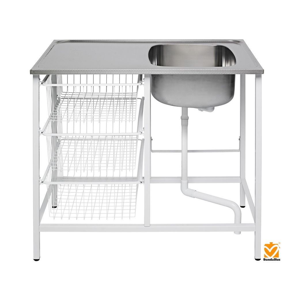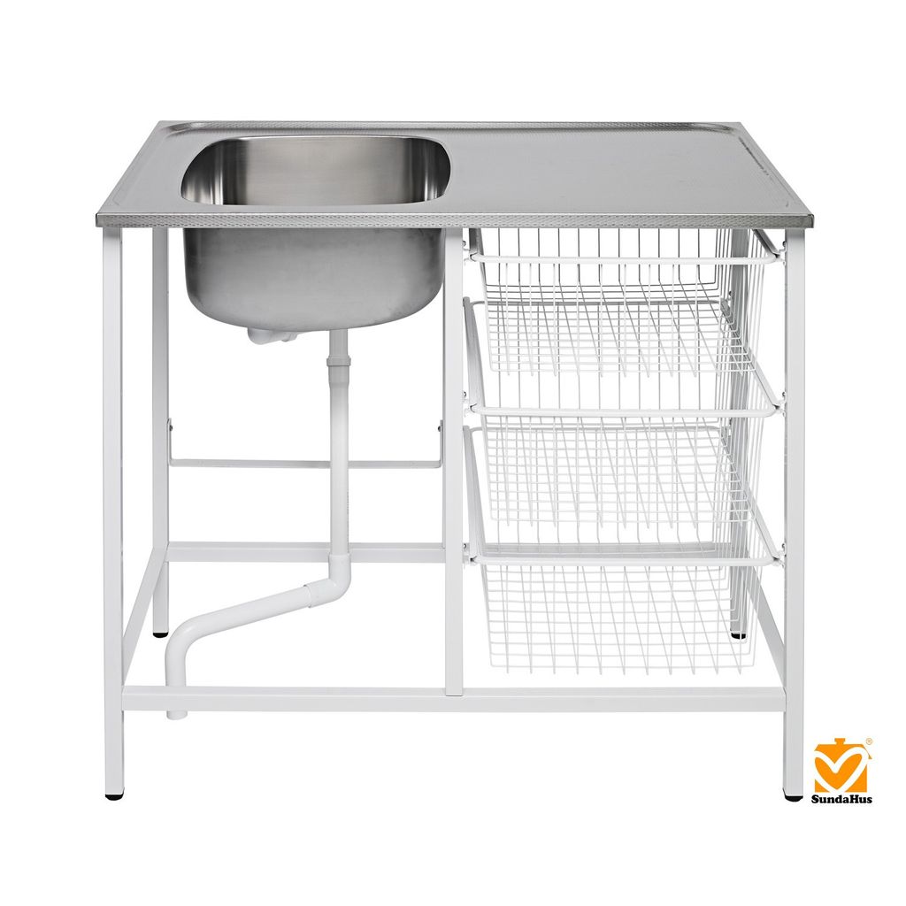 Vändbar tvättbänk i linnemönstrad rostfri plåt med tre trådkorgar och justerbara fötter. Levereras monterad eller omonterad – välj själv!