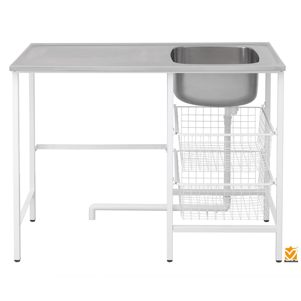 Tvättbänken har ett rymligt förvaringsutrymme med två trådkorgar samt justerbara fötter för att kompensera golvlutning. Bänken levereras utan kranhål och finns som monterad eller omonterad i kartong – välj det alternativ som passar dig bäst.