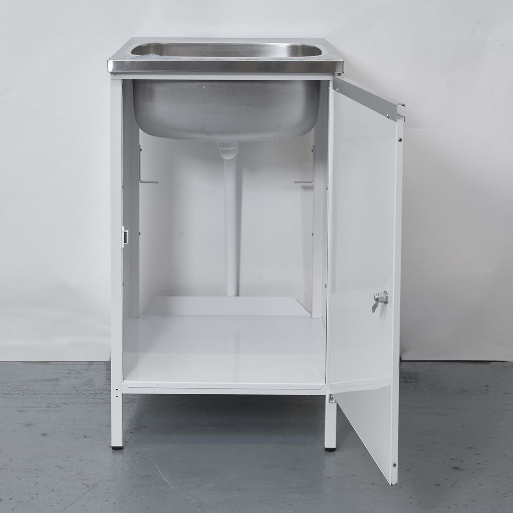 Tvättbänk i rostfritt stål med låsbart skåp, ställbara fötter och rymlig disklåda. Perfekt för grovkök, tvättstuga eller verkstad.