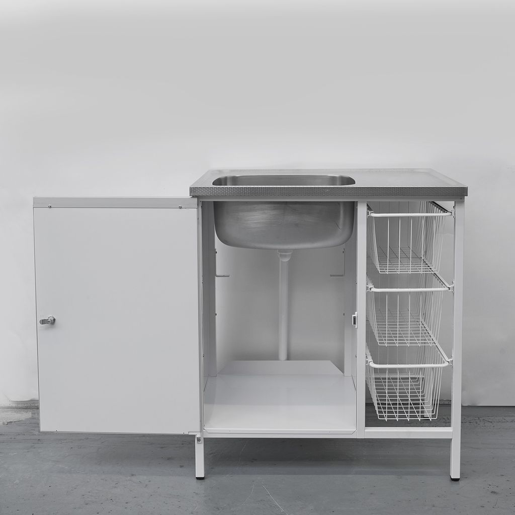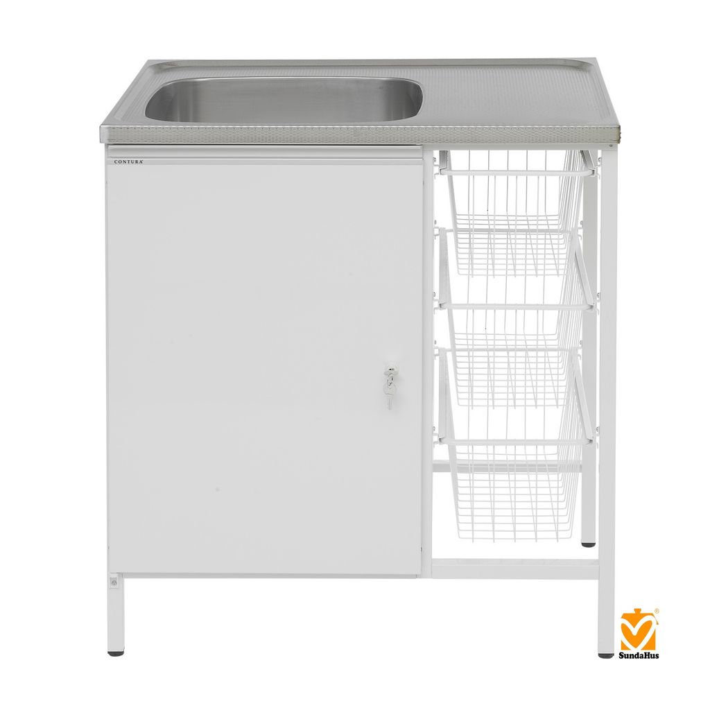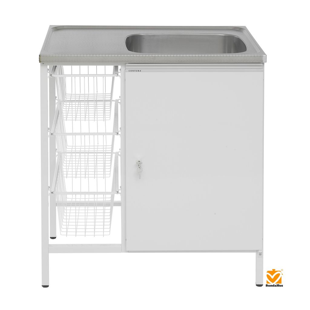 CAB 8 är en rymlig och tålig tvättbänk i rostfri plåt med tre trådkorgar, barnsäkert skåp och justerbara fötter – idealisk för tvätt- och grovutrymmen.