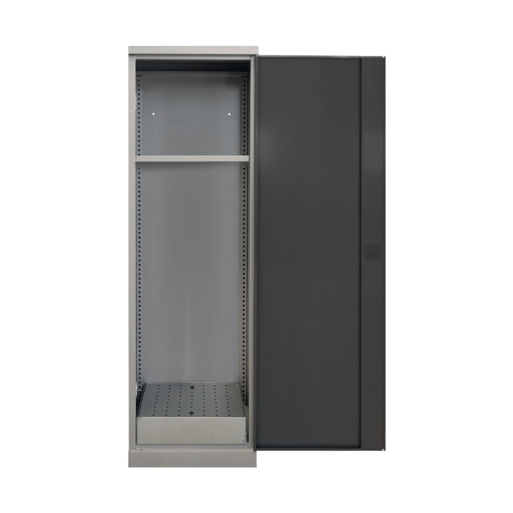 Skåpet levereras komplett med ett flyttbart uppsamlingskärl på 55 liter och en hylla med 50 liters kapacitet. I botten finns en tömningsmöjlighet via 50 mm hål, och ovandelen är förberedd med ett 100 mm ventilationsuttag för extern frånluftsanslutning. En praktisk lösning för verksamheter som behöver uppfylla höga krav på kemikaliehantering.