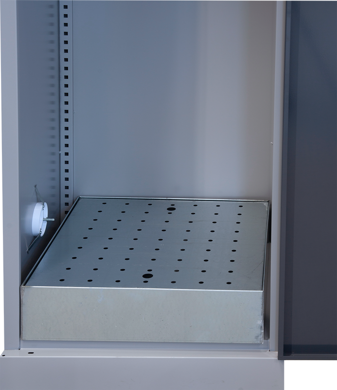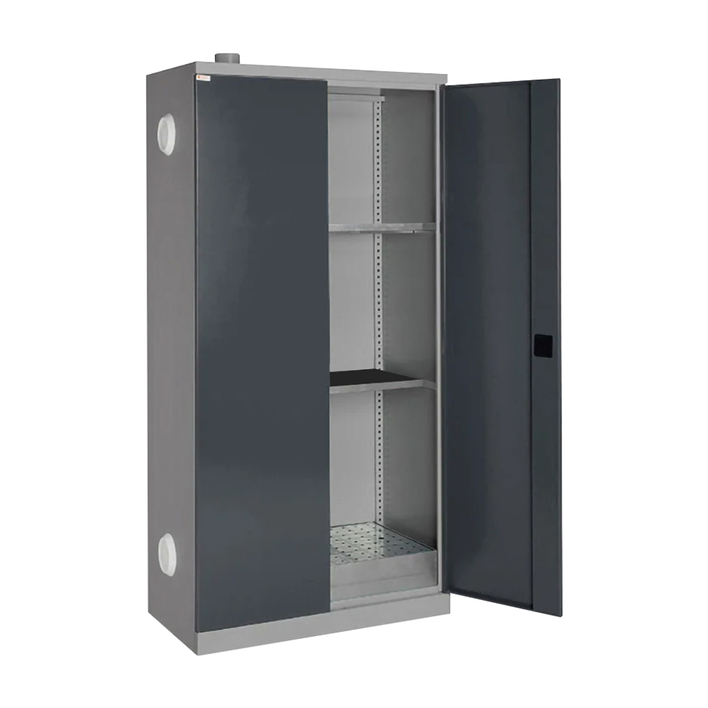 Kemikalieskåp med två hyllor och uppsamlingslåda i botten. Stabil och ventilerad konstruktion för icke brandklassad kemikalieförvaring. Anslutning för frånluft.
