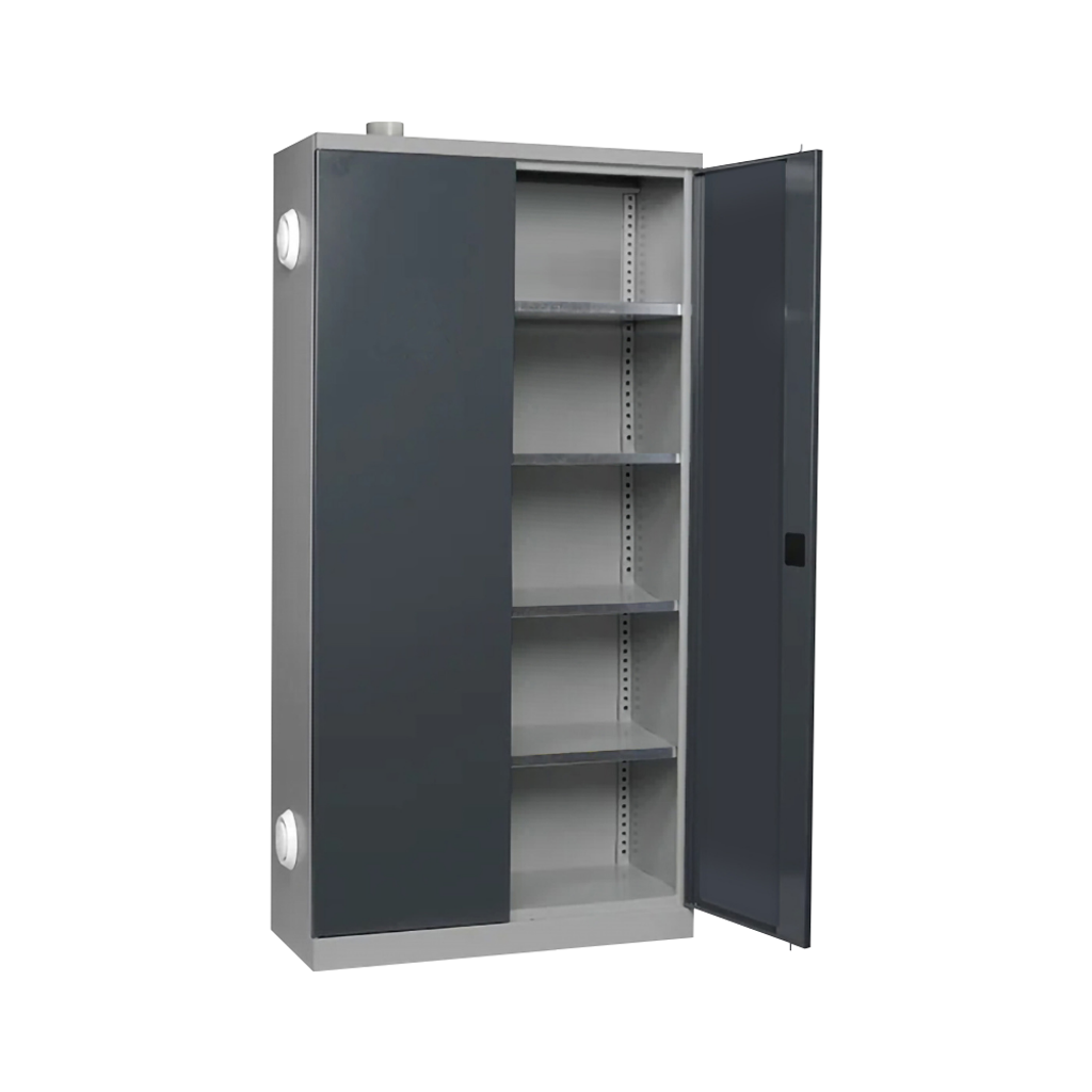 Rymligt kemikalieskåp med fyra galvaniserade hyllor och ventilationsmöjlighet. Säker, stabil förvaring utan brandklassning – idealiskt för kemikalier i ventilationsanslutna utrymmen.