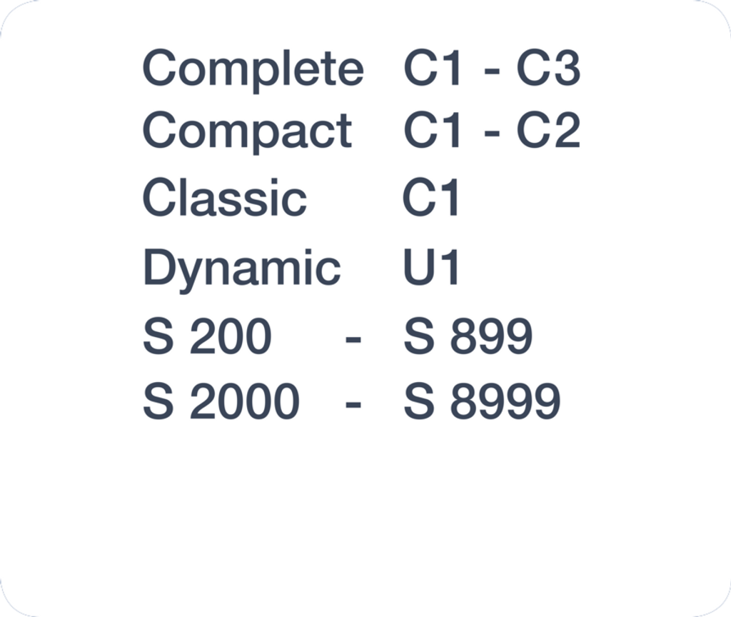 - bland annat Complete C1-C3, Compact C1-C2, Classic C1, Dynamic U1