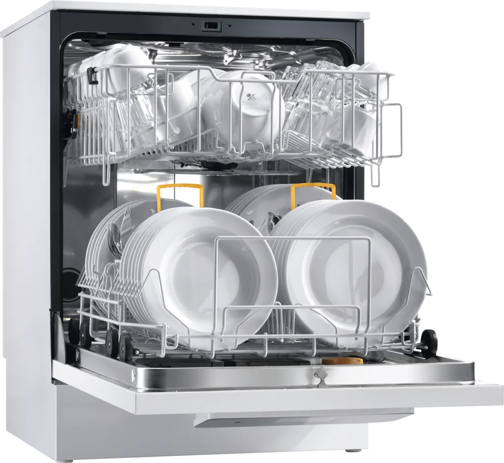 Kraftfull och fristående diskmaskin med färskvattensystem, M Touch Basic-display och plats för 285 tallrikar per timme – perfekt för restauranger och skolor.