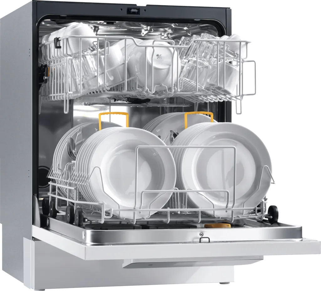 PFD 404 U DOS är en kraftfull och hygienfokuserad underbyggnadsdiskmaskin från Mieles MasterLine-serie – utformad för vårdhem, förskolor, sjukhus och andra miljöer med höga krav på renhet. Den är utrustad med ett färskvattensystem som säkerställer konstant hygienisk diskning, och klarar upp till 456 tallrikar i timmen tack vare sina två diskplan och korta programtider.