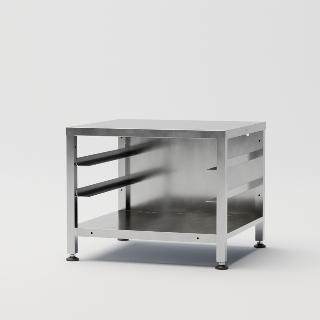 Skapa bra ergonomiska förutsättningar med bra arbetshöjd där maskinen står på sitt stativ. Plats för förvaring av tre diskbackar undertill. Gjord av rostfritt stål. Förvaring av 3 diskbackar. B 598 x Dj 560 x H 485 (± 10) mm.