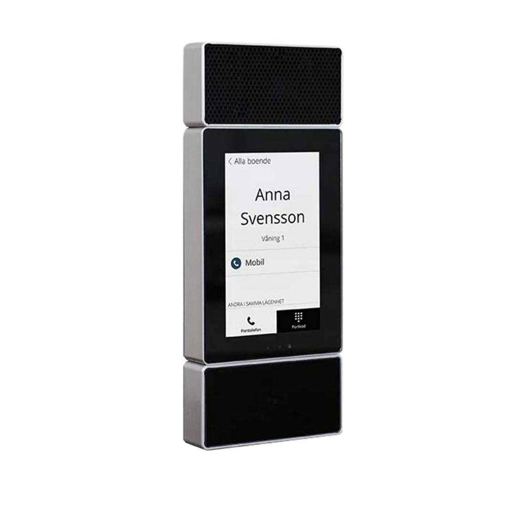 Enheten har en stilren och vädertålig design som gör den lämplig för montage i trapphus eller utomhus. Den inbyggda skärmen på 5 tum ger tydlig översikt, och samtalsfunktionen minimerar behovet av fysiska nycklar eller manuell hantering av porten.
