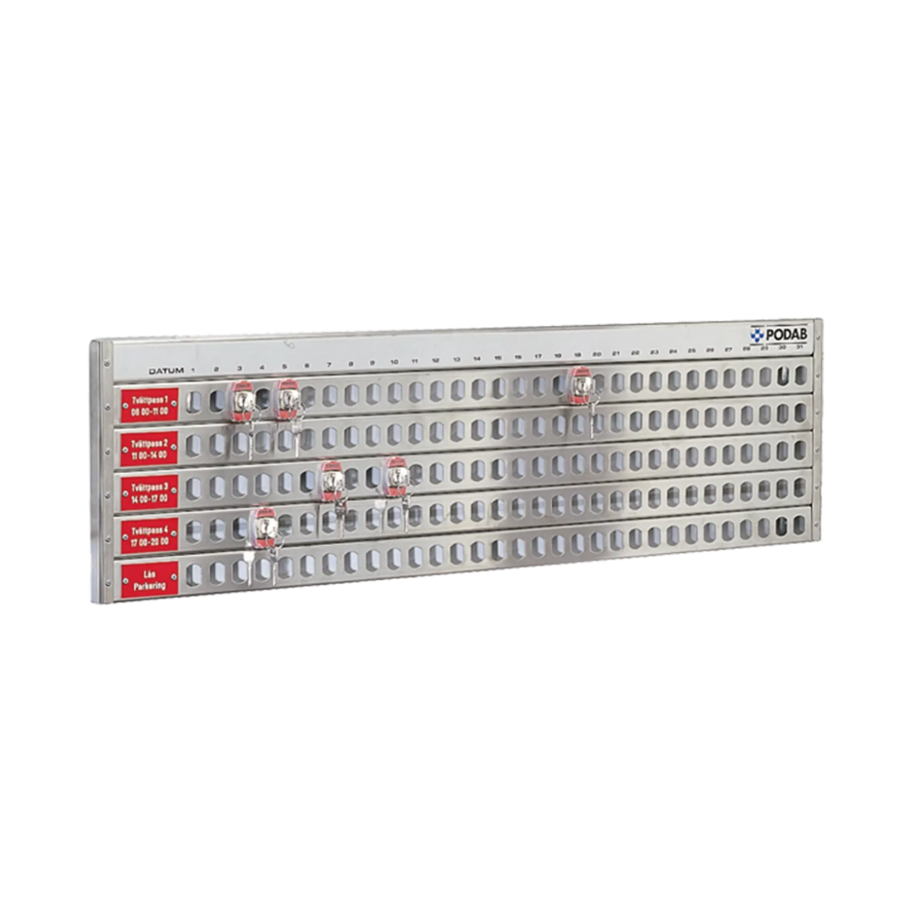 Analog bokningstavla för 2–8 tvättpass, komplett med parkeringsskena. Klassisk lösning för bokning i tvättstugan med låscylindrar.