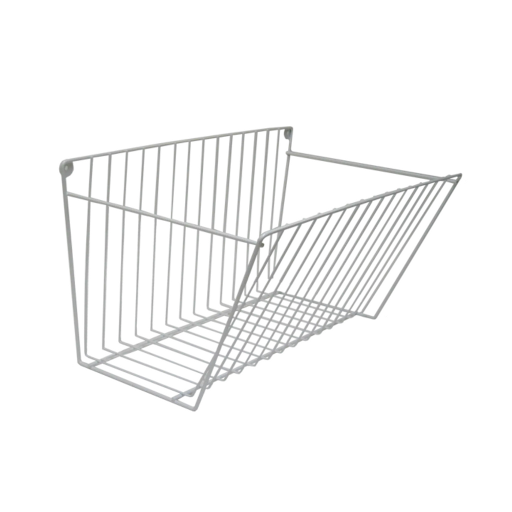 Vit korg som placeras under lakansträckare för att underlätta hopvikning och hålla lakanen borta från golvet i tvättstugan.