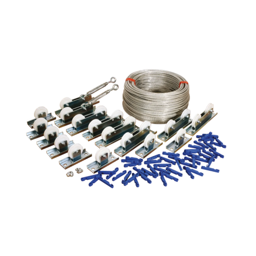 Denna kompletta torklinesats ger en stabil och effektiv torklösning för gemensamma torkrum. Tack vare dubbla linpar och smarta distansclips förbättras luftcirkulationen, vilket kortar torktiden och gör det enklare att hänga tvätt. Vajern är plastbelagd för lång hållbarhet och klarar hög belastning över tid.