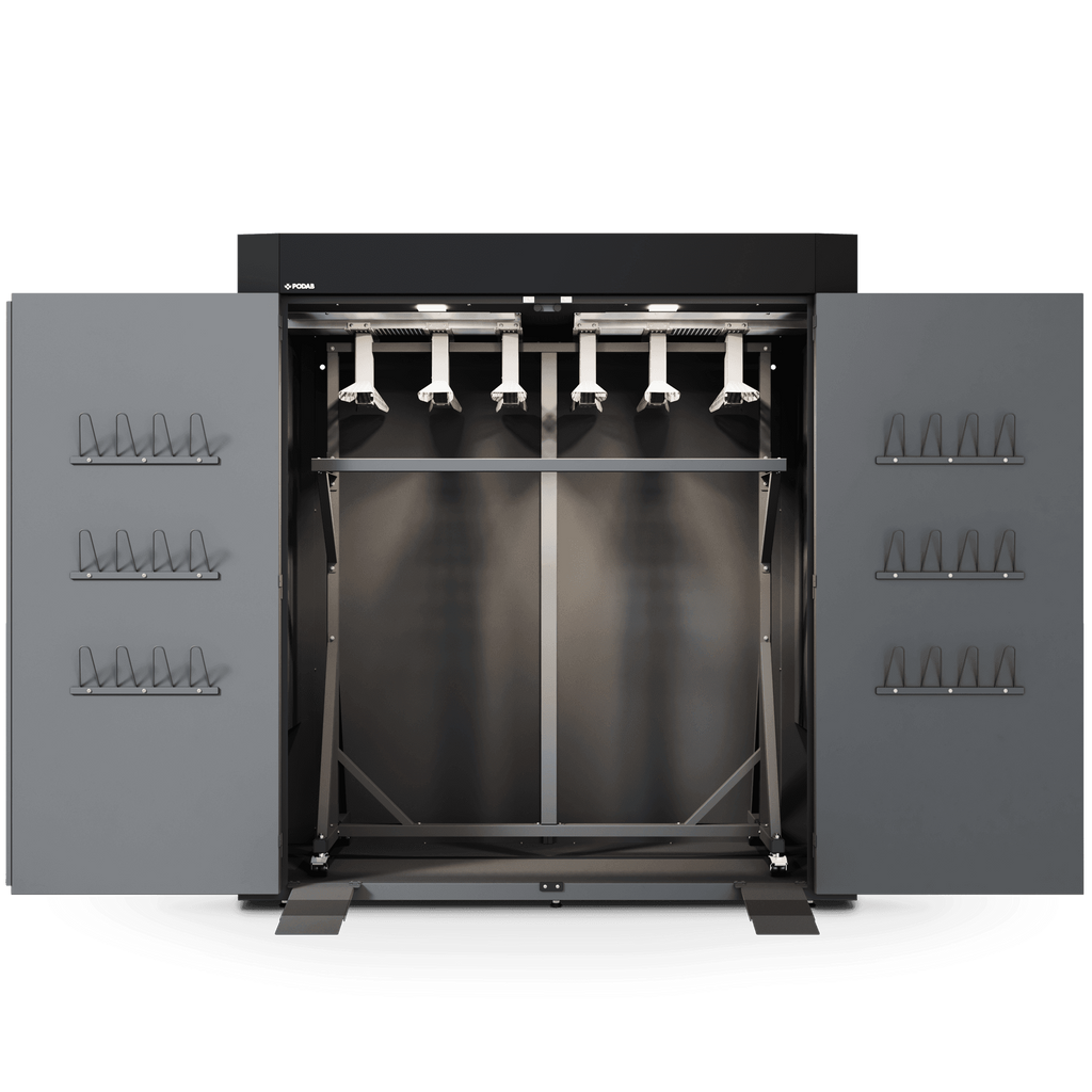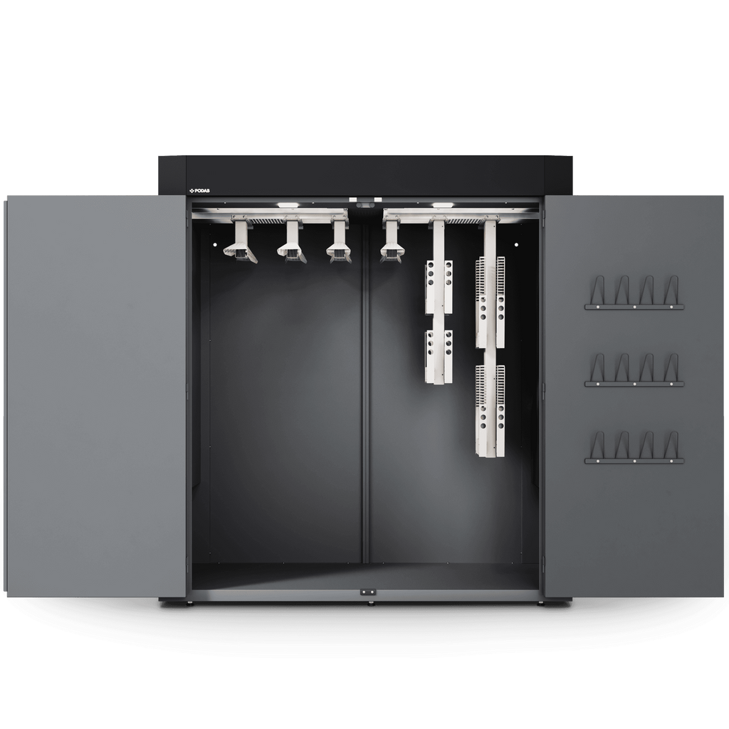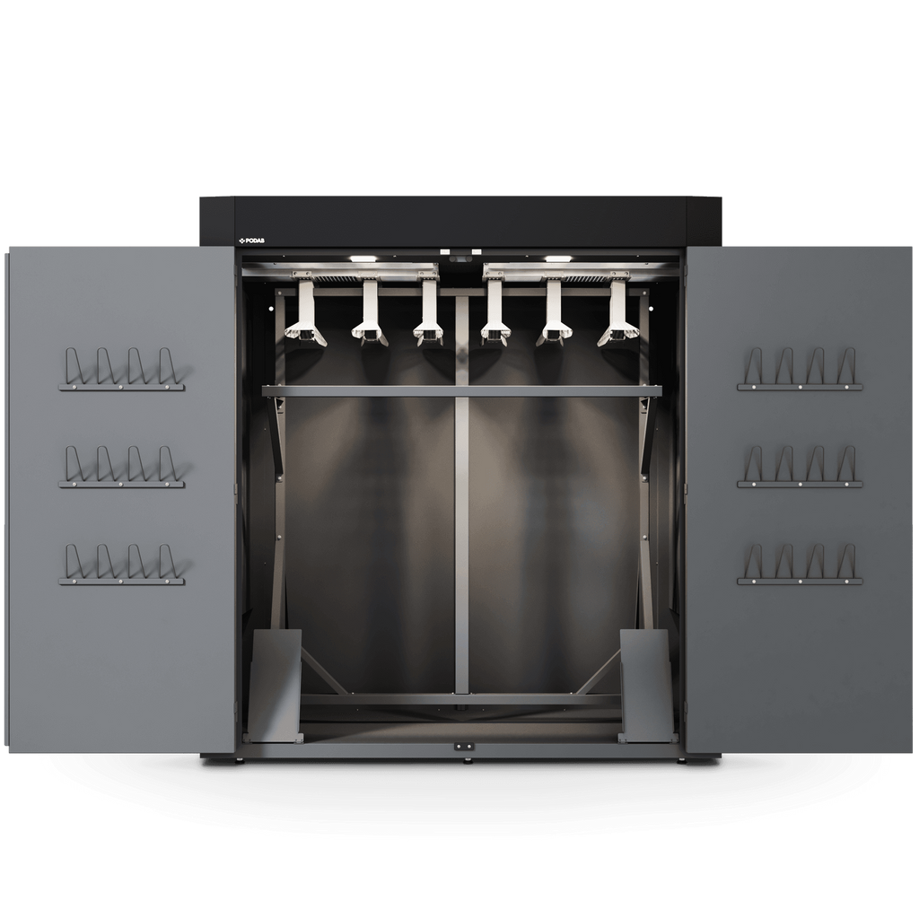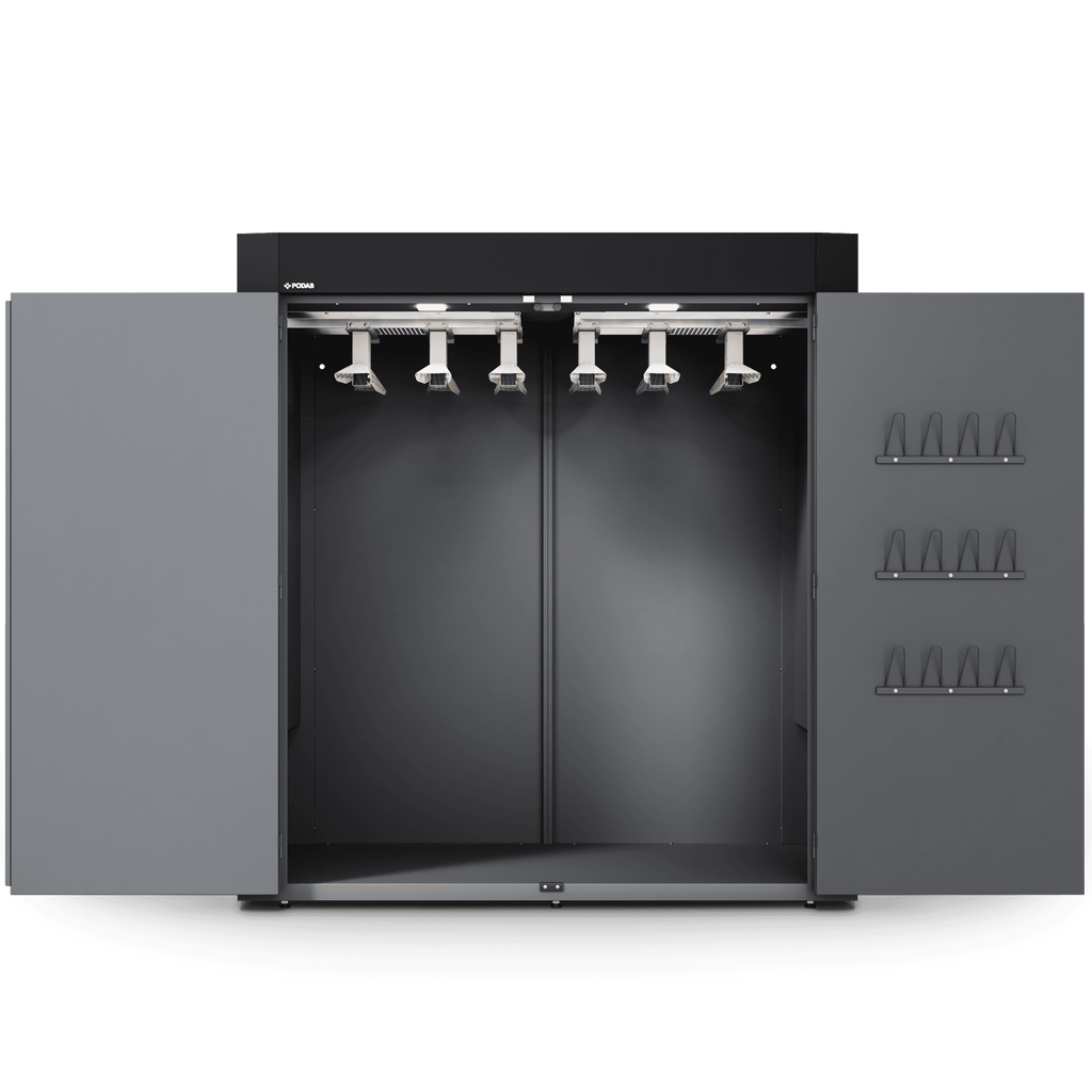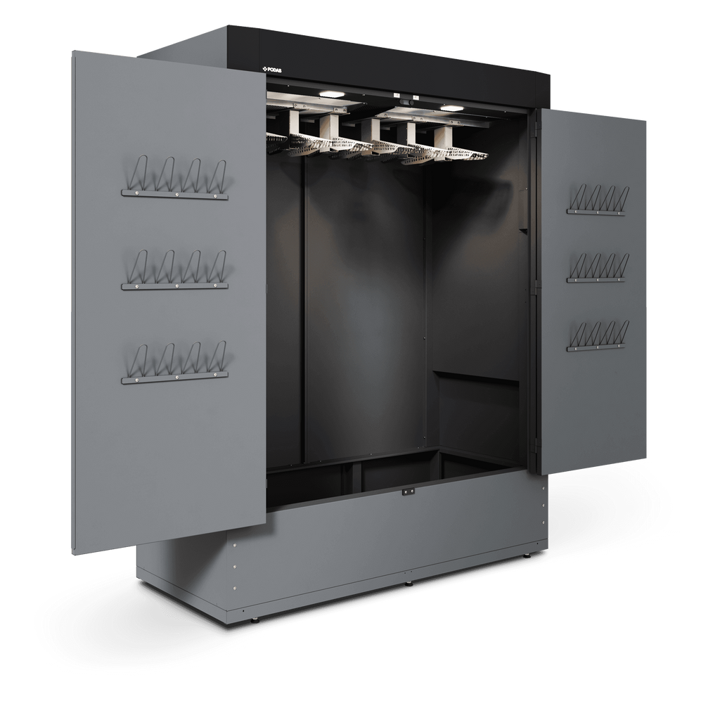 Torkskåp för upp till sex larmställ. Utrustat med specialgalgar, automatiska torkprogram och HTS för skonsam och effektiv torkning av skyddskläder.