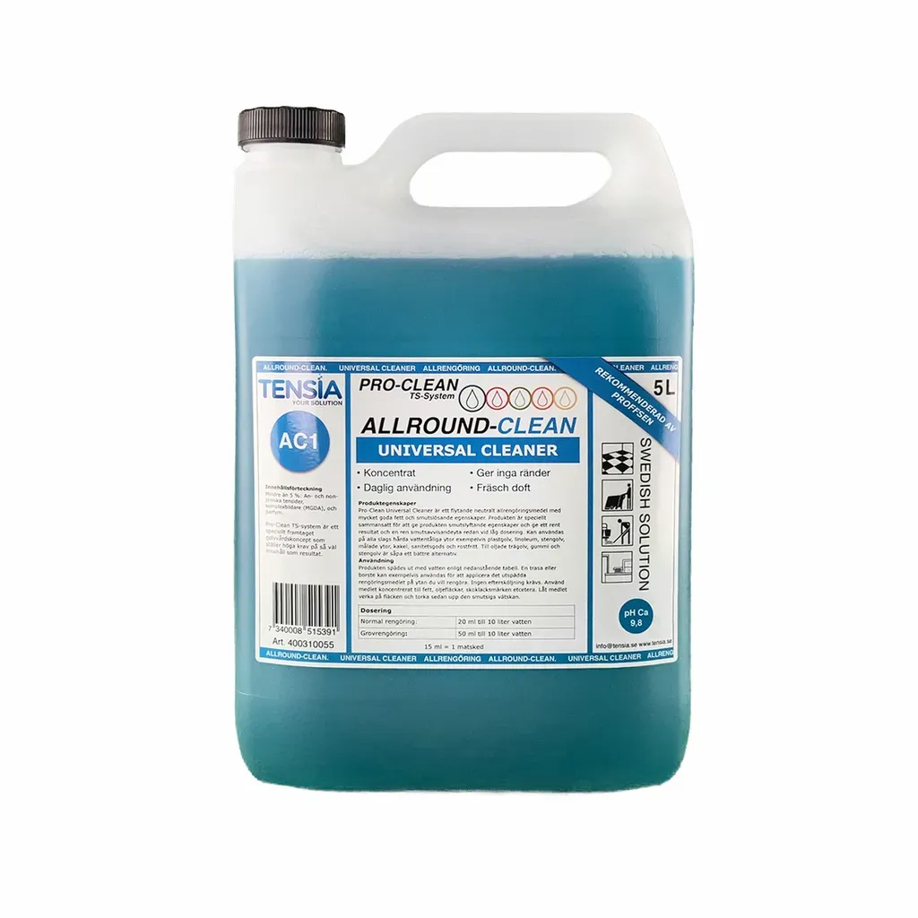 Universalrengöring Pro-Clean är ett neutralt och högpresterande allrengöringsmedel för professionell användning. Den är speciellt utvecklad för att effektivt lösa fett och smuts på ett brett spektrum av hårda ytor, som plastgolv, linoleum, rostfritt stål, sanitetsgods och kakel. Med sin smutsavvisande egenskap och fräscha doft lämnar den ytor rena och utan ränder – även vid låg dosering.
