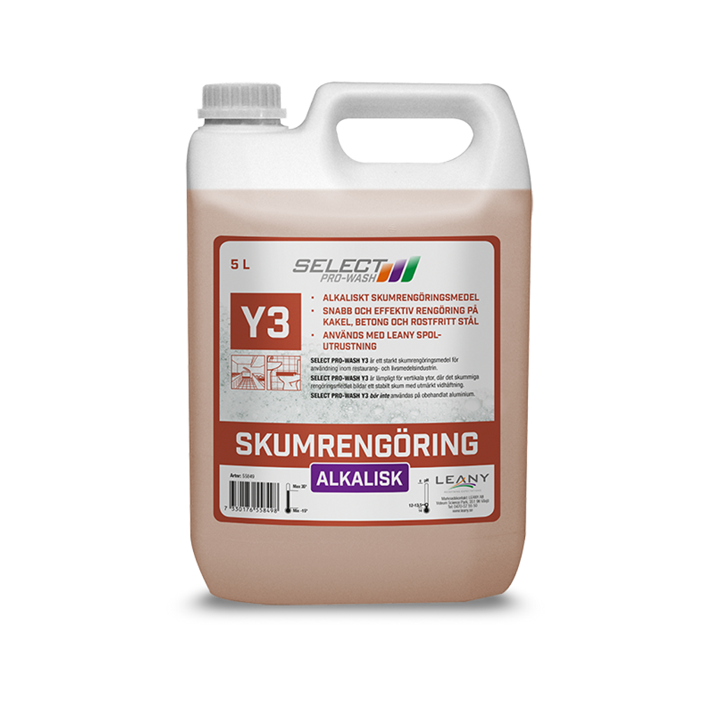 SELECT PRO-WASH Y3 är ett starkt alkaliskt skumrengöringsmedel anpassat för professionell rengöring inom restaurang- och livsmedelsindustrin. Produkten lämpar sig särskilt väl för rengöring av kakel, betong och rostfritt stål där effektiv smutsborttagning krävs.