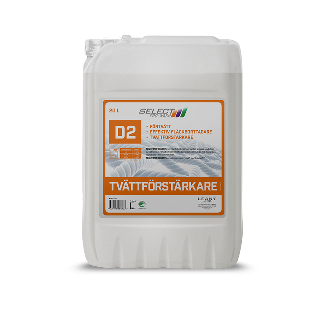 SELECT PRO-WASH D2 är en flytande tvättförstärkare som är särskilt framtagen för att avlägsna svår smuts från textilier, såsom mineraliska, vegetabiliska och animaliska fetter. Produkten kan användas både i förtvätt och huvudtvätt och är kompatibel med alla typer av professionella tvättmaskiner. Vid behov kan SELECT PRO-WASH D2 även användas som ensam produkt i förtvätt, enligt ett 1:2-förhållande.