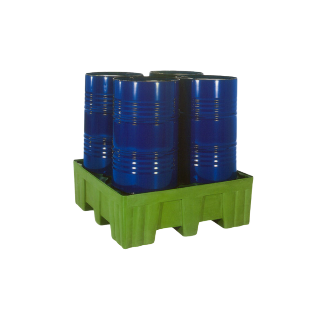 Grön skyddspall 1300x1300x445 mm för 4 stående fat. Robust konstruktion med urspårning och 9 pallfötter – 450 liters uppsamlingsvolym.