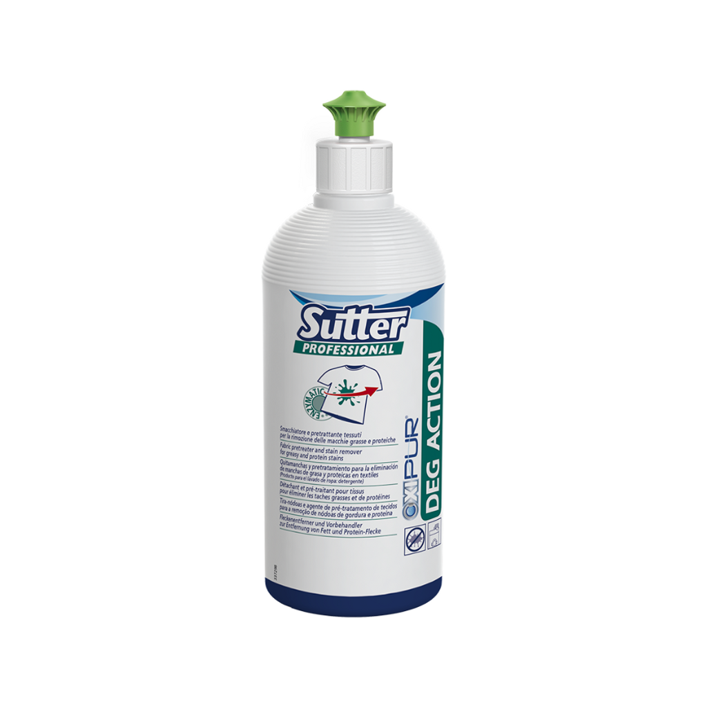 Sutter DEG ACTION är ett professionellt förbehandlingsmedel och fläckborttagare för textilier, särskilt utvecklat för att hantera fett- och proteinbaserade fläckar. Produkten kan användas både före och efter tvätt och är effektiv på textilier av bomull, polyester, blandmaterial samt mer känsliga fibrer som ull, silke och viskos.