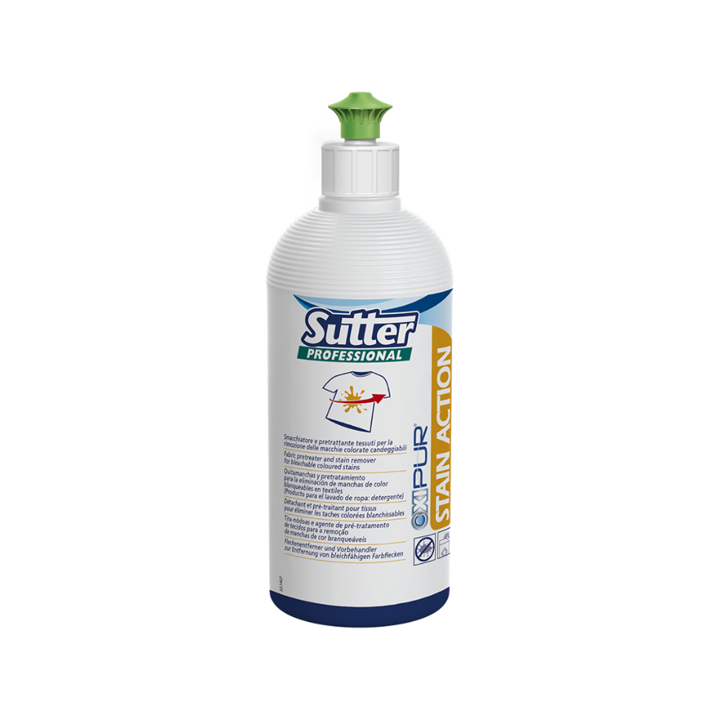 Sutter STAIN ACTION är ett professionellt förbehandlingsmedel och fläckborttagare för blekbara, färgade fläckar såsom kaffe, vin, frukt, gräs och läsk. Produkten är framtagen för att användas både före och efter tvätt, och är särskilt effektiv i kombination med Oxipur-systemet för att minska behovet av omtvätt.