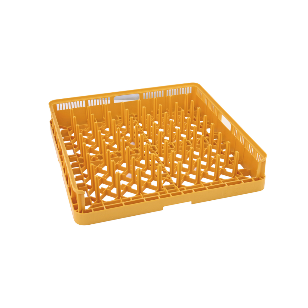 För stora brickor. Det glesa bottengallret medger maximal vattenspolning underifrån. Korgarna är tillverkade i värme- och kemikaliebeständig plast. Max arbetstemp. 95°C. Yttermått 500x500x97mm. Innermått 464x464x69mm.