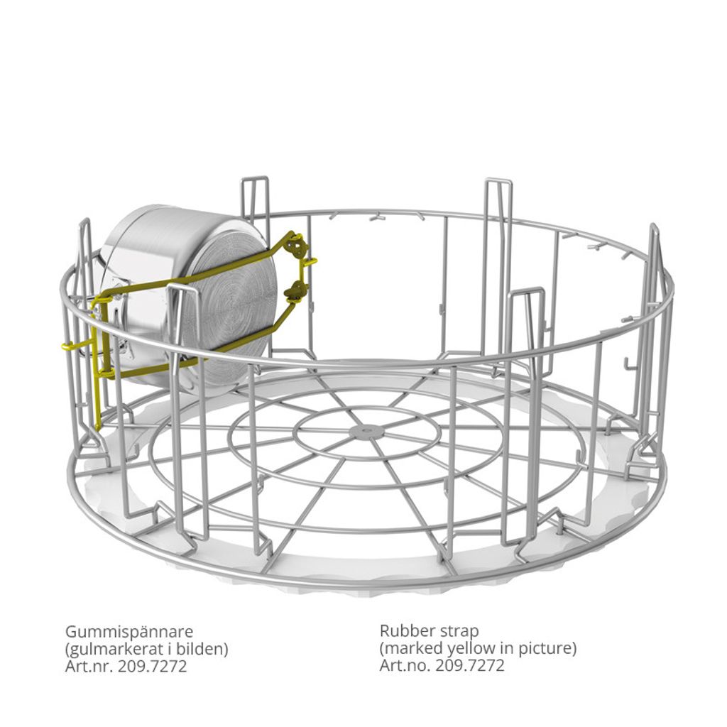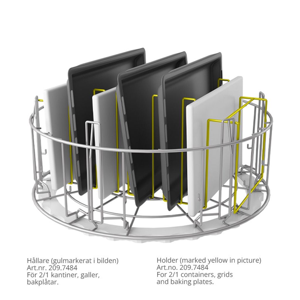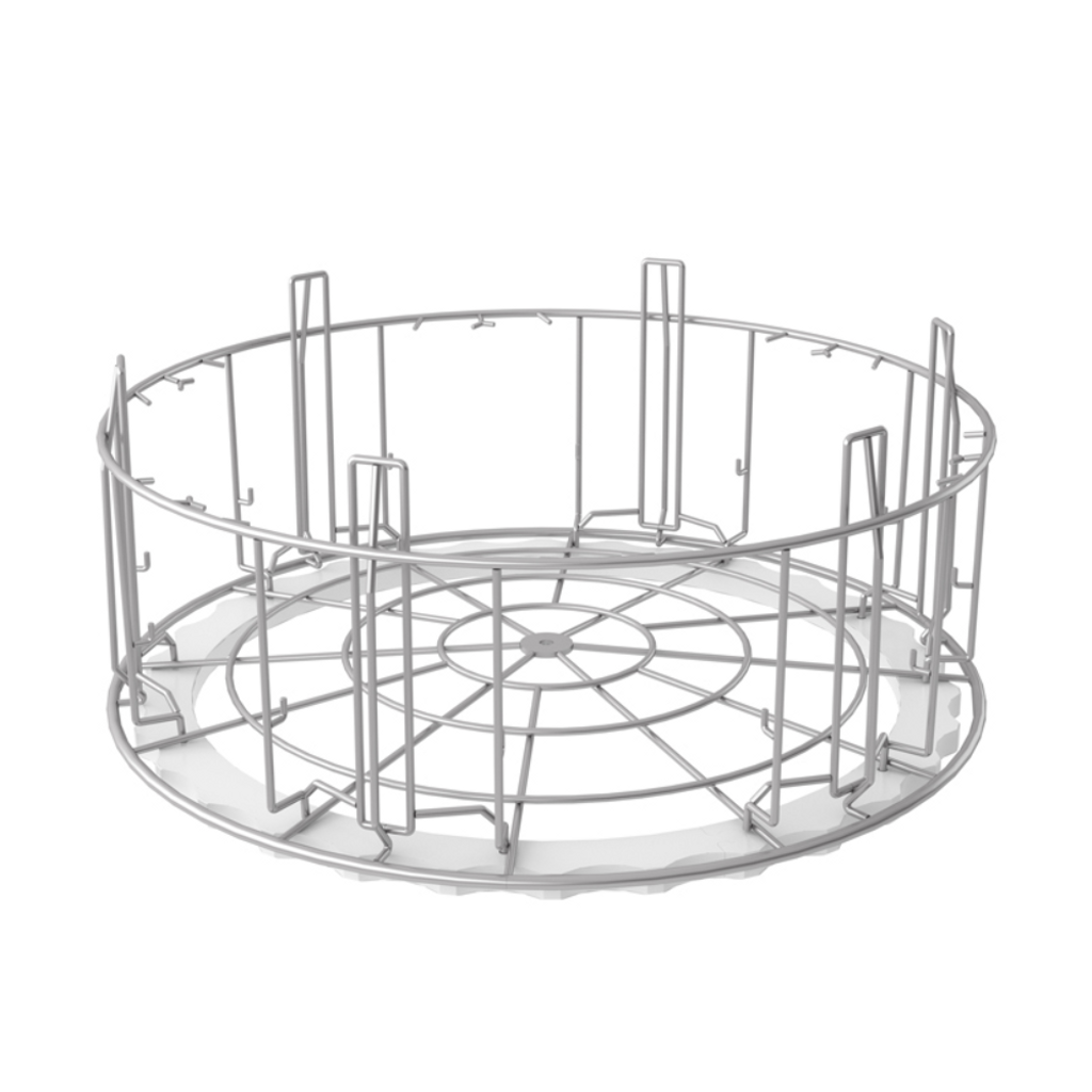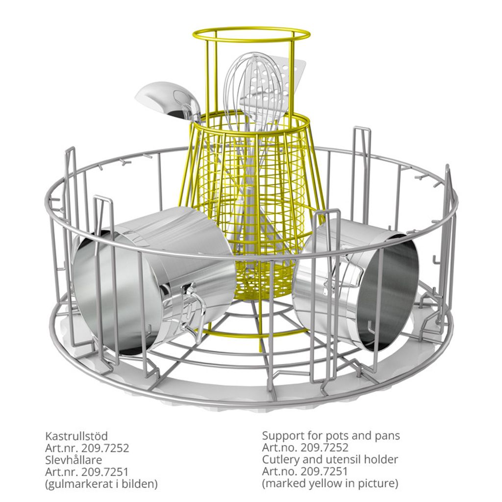 Rund grovdiskkorg i rostfritt stål som tillsammans med olika tillbehör tar hand om disken för kastruller, grytor, kantiner etc.