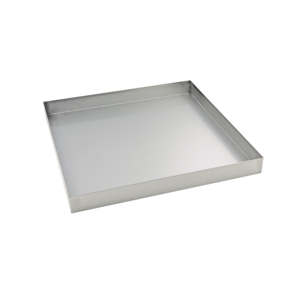 Spillbricka i rostfritt stål för diskkorgar 500 × 500 mm. Håller diskrummet torrt och skyddar mot spillvatten och vattenskador.